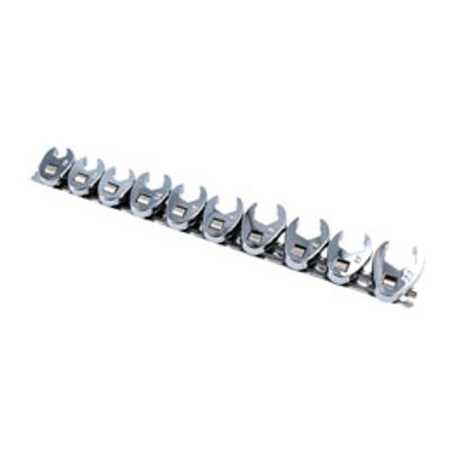 Set of crows foot wrenches in ten common sizes from 10mm to 22mm for use with 3/8" square drive extension bar and ratchet, for improved access in confined areas. The flare nut head provides a firm grip for more torque without damaging the fastener. The wrenches are manufactured from carbon steel with a chrome, fully polished finish and are supplied on a tool rail for convenient storage, with holes for wall or toolbox mounting. Designed for use with 3/8"D extension. Sizes: 10, 11, 13, 14, 15, 16, 17, 18, 19, 22mm.Flare nut Hex (6pt) head. Provides a secure grip for reduced risk of fastener damage, with open jaw to fit around pipes & cables. Manufactured from carbon steel with a chrome polished finish. Supplied on a wall mountable rail (320mm long).