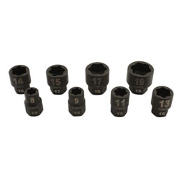 A set of special profile sockets for removing damaged nuts and bolts. Special profile grips damaged or rounded nuts and bolts.Sizes: 8, 9, 11, 13, 14, 15, 17, 19mm. Supplied in blow mould case for storage. Manufactured from chrome molybdenum with black phosphate finish.