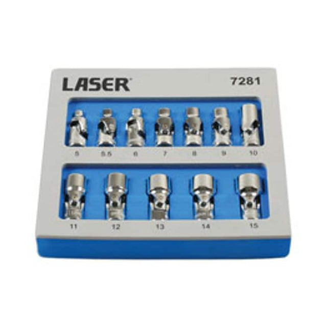 A set of 1/4"D universal joint sockets with single Hex profile provide greater access to confined spaces. Sizes: 5, 5.5, 6, 7, 8, 9, 10, 11, 12, 13, 14, 15mm.1/4"D x single Hex (6pt) profile. Ideal for use in confined areas. Manufactured from polished chrome vanadium.