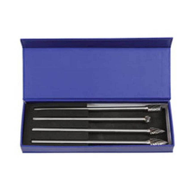 A 4 piece tungsten carbide burr set for cutting, shaping, grinding and for the removal of sharp edges. 4 profiles with 6mm shank.Tree shaped 12mm cut diameter (25mm cut length) x 150mm shank length. Tree shaped 10mm cut diameter (20mm cut length) x 150mm shank length. Ball shaped 10mm cut diameter (9mm cut length) x 150mm shank length.