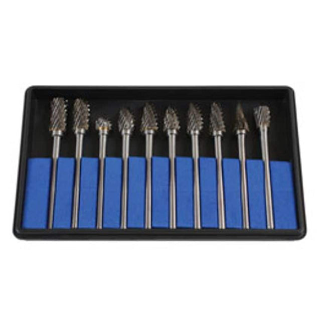 A 10 piece tungsten carbide burr set for cutting, shaping, grinding and for the removal of sharp edges. 10 profiles with 3mm shank; length: 38mm.Cylinder shaped head and cylinder shaped radius x 13mm cut length. Ball shaped head x 3mm cut length; flame shaped head x 7mm cut length; tapered shaped radius end x 13mm cut length. Oval shaped head x 7mm cut length; cone shaped head x 13mm cut length; inverted cone shaped head x 5mm cut length.