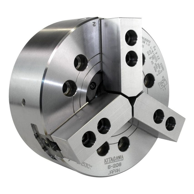 Kitagawa chucks are manufactured from high grade alloy steel. Three jaw wedge style power chucks deliver up to 20% more speed, gripping force and bore size when compared to conventional chucks.B200 series chucks are supplied with a blank drawnut as standard with a set of T-nuts.Features & Benefit The Worlds Most Popular Chuck Compatible with large, readily available, range of jaws Upto 20% more speed and grip force than conventional chuck