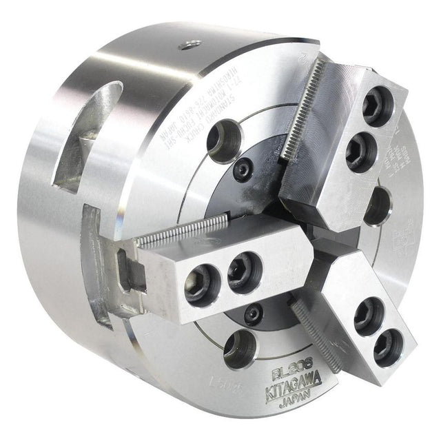 Kitagawa chucks are manufactured from high grade alloy steel. The BL Series chucks have been designed with a lever style mechanism rather than the standard wedge to allow for increased jaw stroke. The increased jaw stroke allows for larger diameters to pass by the jaws then holding on a smaller diameter. This works well for products with stepped diameters or large flanges. BL200 series chucks are supplied with a blank drawnut as standard with a set of T-nutsFeatures & Benefit Lever style mechanism allows for increased jaw stroke Compatible with large, readily available, range of jaws Increased jaw stroke allow for flanged workpeices to be loaded past the jaws