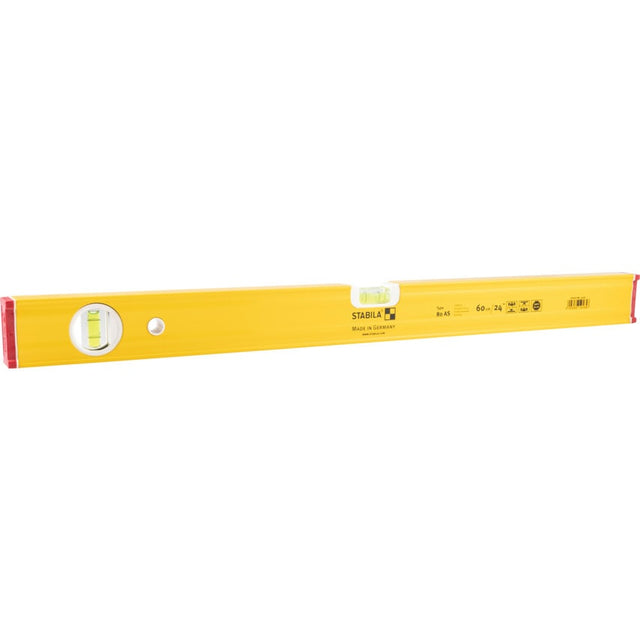 Type 80AS spirit level offers a reliable and accurate measurement. The measuring surfaces and the vials align with one another; they are permanently connected, guaranteeing the very best in measuring accuracy over many years. Each product has o1 vertical and 1 horizontal vial to enable readings in any position. Available in an array of sizes to suit your needs.Features and Benefits End caps to protect the level against impact 2 coated surfaces to protect delicate surfaces and offer accurate measurements as well as enabling accurate measuring in all positions Anti-slip stoppers integrated to allow for a firm hold when marking Reinforcing ribs and an aluminium rectangle profile for high stability and a long service life STABILA technology ensures accuracy even over time due to the precision calibration; the measuring accuracy in a normal position is 0.5 mm/m and 0.75 mm/m in reverse position The unique design vials are designed for optimum readability due to their composition of extremely transparent and durable acrylic glass that possesses precision-ground inner contours and optimum visibility vial liquid Easy to clean due to the electrostatic powder coating Each product possesses 2 vials; 1 horizontal vial and 1 vertical vialTypical Applications Plumbing Engineering Construction DIY