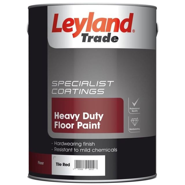 Leyland Trade Heavy Duty Floor Paint 5L Tile Red Leyland Heavy Duty Floor Paint provides a hard wearing, protective, satin finish designed to withstand spillage and repeated cleaning. Ideal for use on most concrete and wooden floor areas such as garages, warehouses, workshops and factories.