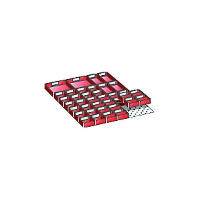 Divider set for drawer dimensions 459 x 612 mm, insert boxes made of plastic, 38 insert boxes. Supplied = flat pack. For drawer height = 50 mm. Number of bins = 38 pcs. Internal drawer dimensions = 459x612 mm. Product type = accessories. Ideal for small parts and bulk materials. Ideal for parts of different sizes. Red insert boxes made of impact resistant polystyrene.