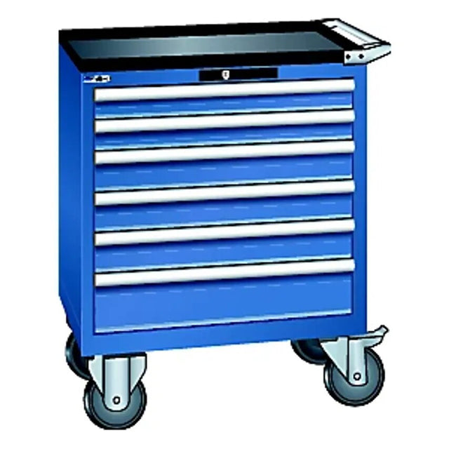 Drawer cupboard, mobile, WxDxH 717 x 572 x 962 mm, drawers 2 x 75/3 x 100/1 x 150 mm, gentian blue. Supplied = assembled. Height = 962 mm. Width = 717 mm. Depth = 572 mm. Max. drawer load = 75 kg. Number of drawers = 6 pcs. Drawer height = 2x75/3x100/1x150 mm. Drawer extension = 100%. Body colour = gentian blue RAL 5010. Front colour = gentian blue RAL 5010. Fittings = individual pull-out stop. Material = sheet steel. Drawer guide = differential guide rails without cross beams. Lock type = KEY Lock standard locking with replaceable cylinder incl. 2 keys with key number. Internal drawer dimensions = 612x459 mm. Feature = mobile, can be labelled. Overall max. load = 600 kg. Wheel fittings = rubber castors. With rubber castors 100 mm. Greater mobility due to smooth running castors. Optimum use of space when placed under work surfaces. Raised edges on four sides prevent the transported goods from rolling off. Drawers with individual latches to protect against unintentional opening. High max. drawer load of 75 kg. Full security and convenience due to all round raised edges, ergonomic push bar and additional drawer locks. Drawer locks with individual latch on the right: the drawer lock positioned on the right is released using one hand, and prevents unintentional opening of the drawers even when the cupboard is unlocked. Drawers 100% extendable. 2 swivel castors with wheel stops, 2 fixed castors. Cylinder lock with replaceable core (2 keys incl.) and key number. Can be used as a main locking system (common key or individual key) Sturdy, powder coated steel construction. 12 standard colours available upon request at no extra cost. Also available upon request: combination lock or RFID lock instead of a cylinder lock.