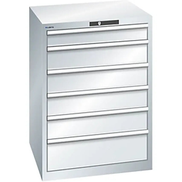 Drawer cupboard, 6 drawers, WxDxH 717 x 725 x 1000 mm, light grey. Supplied = assembled. Height = 1000 mm. Width = 717 mm. Depth = 725 mm. Max. drawer load = 200 kg. Number of drawers = 6 pcs. Drawer height = 1x100, 4x150, 1x200 mm. Drawer extension = 100%. Body colour = light grey RAL 7035. Front colour = light grey RAL 7035. Fittings = individual pull-out stop. Material = welded sheet steel. Drawer guide = differential guide rails without cross beams. Lock type = KEY lock (individual keys) with central locking and replaceable cylinder, incl. 2 keys with key number. Internal drawer dimensions = 612x612 mm. Feature = can be labelled. Overall max. load = 4000 kg. Drawer cupboard paintwork: Impact resistant and hardwearing surface due to environmentally friendly powder coating. Paintwork inside drawers: Full surface corrosion protection due to electro-deposition immersion painting, dove grey, NCS S 4502-B. Material: Very hardwearing due to precise and sturdy construction using high quality, welded sheet steel, max. load up to 4 tonnes. Tight closing drawer construction provides protection from dust and liquids. Individual drawer lock with lift-out protection, perfect usability due to 100% utilisation of space and free choice of partition material. Clearance height: 900 mm. Drawer WxD 612 x 612 mm, arrangement of front heights/effective heights: 100/82.5, 150/132.5, 150/132.5, 150/132.5, 150/132.5, 200/182.5 mm.