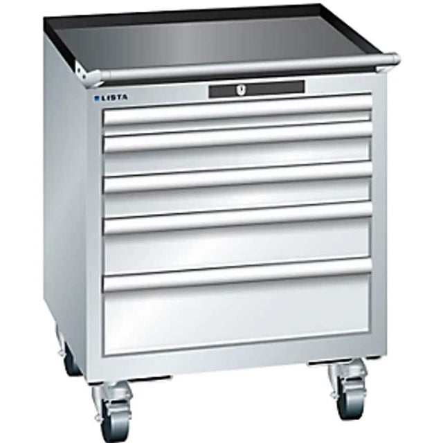 Drawer cupboard, width 564 mm, mobile, 5 drawers, HxD 723 x 572 mm, light grey. Supplied = assembled. Height = 723 mm. Width = 564 mm. Depth = 572 mm. Max. drawer load = 75 kg. Number of drawers = 5 pcs. Drawer height = 1x50, 2x75, 1x100, 1x150 mm. Drawer extension = 100%. Body colour = light grey RAL 7035. Front colour = light grey RAL 7035. Fittings = individual pull-out stop. Material = welded sheet steel. Drawer guide = differential guide rails without cross beams. Lock type = KEY lock (individual keys) with central locking and replaceable cylinder, incl. 2 keys with key number. Internal drawer dimensions = 459x459 mm. Feature = can be labelled, mobile. Overall max. load = 4000 kg. Wheel fittings = 2 swivel castors with wheel stop, 2 fixed castors. Drawer cupboard paintwork: Impact resistant and hardwearing surface due to environmentally friendly powder coating. Paintwork inside drawers: Full surface corrosion protection due to electro-deposition immersion painting, dove grey, NCS S 4502-B. Material: Very hardwearing due to precise and sturdy construction using high quality, welded sheet steel, max. load up to 4 tonnes. Tight closing drawer construction provides protection from dust and liquids. Mobile equipment Standard extension units: 1 four-sided raised edges including ribbed mat, 1 push bar, 1 pair of castor holders with 4 nylon castors 100 mm (2 swivel castors with wheel stops, 2 fixed castors) , drawer pull-out stop on right, height of raised edge incl. push rod 53 mm, height of pair of castor holders 137 mm, max. load of castors 400 kg. Direction of travel: lengthwise. Individual drawer lock with lift-out protection, perfect usability due to 100% utilisation of space and free choice of partition material. Clearance height: 450 mm. Drawer WxD 459 x 459 mm, arrangement of front heights/effective heights: 50/32.5, 75/57.5, 75/57.5, 100/82.5, 150/132.5 mm.