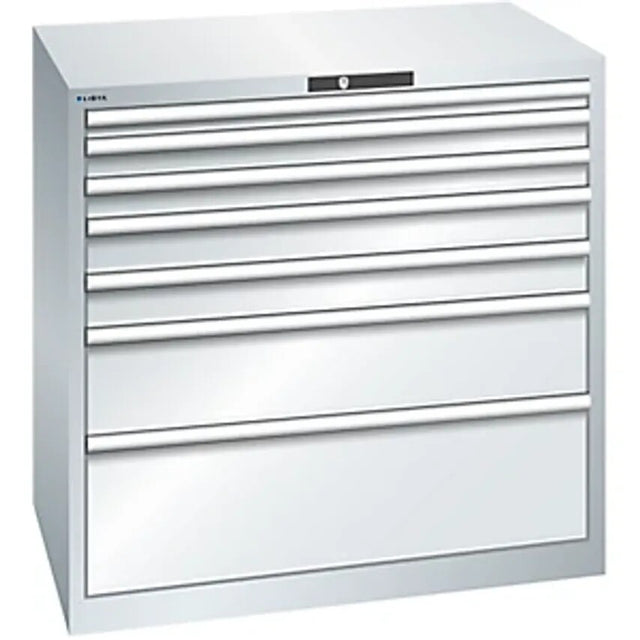 Drawer cupboard, 7 drawers, WxDxH 1023 x 725 x 1000 mm, light grey. Supplied = assembled. Height = 1000 mm. Width = 1023 mm. Depth = 725 mm. Number of drawers = 7 pcs. Drawer height = 1x50, 2x75, 2x100, 1x200, 1x300 mm. Drawer extension = 100%. Body colour = light grey RAL 7035. Front colour = light grey RAL 7035. Fittings = individual pull-out stop. Material = welded sheet steel. Drawer guide = differential guide rails without cross beams. Lock type = KEY lock (individual keys) with central locking and replaceable cylinder, incl. 2 keys with key number. Internal drawer dimensions = 918x612 mm. Feature = can be labelled. Overall max. load = 4000 kg. Drawer cupboard paintwork: Impact resistant and hardwearing surface due to environmentally friendly powder coating. Paintwork inside drawers: Full surface corrosion protection due to electro-deposition immersion painting, dove grey, NCS S 4502-B. Material: Very hardwearing due to precise and sturdy construction using high quality, welded sheet steel with max. load up to 4 tonnes. Tight closing drawer construction provides protection from dust and liquids. Individual drawer lock with lift-out protection, perfect usability due to 100% utilisation of space and free choice of partition material. Clearance height: 900 mm. Drawer WxD 918 x 612 mm. Arrangement of front heights/effective heights (max. load per drawer in kg) : 50/32.5 mm (75 kg) , 75/57.5 mm (75 kg) , 100/82.5 mm (200 kg) , 200/182.5 mm (200 kg) , 300/282.5 mm (200 kg)