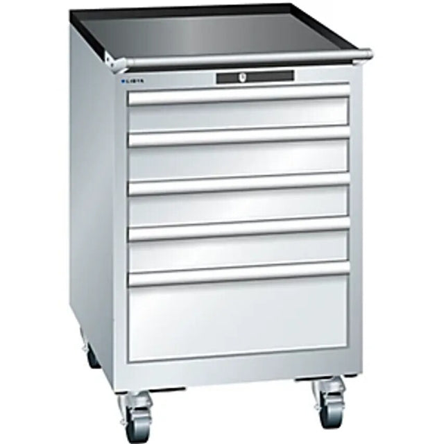 Drawer cupboard, width 564 mm, mobile, 5 drawers, HxD 890 x 572 mm, light grey. Supplied = assembled. Height = 890 mm. Width = 564 mm. Depth = 572 mm. Max. drawer load = 75 kg. Number of drawers = 5 pcs. Drawer height = 4x100, 1x200 mm. Drawer extension = 100%. Body colour = light grey RAL 7035. Front colour = light grey RAL 7035. Fittings = individual pull-out stop. Material = welded sheet steel. Drawer guide = differential guide rails without cross beams. Lock type = KEY lock (individual keys) with central locking and replaceable cylinder, incl. 2 keys with key number. Internal drawer dimensions = 459x459 mm. Feature = can be labelled, mobile. Overall max. load = 4000 kg. Wheel fittings = 2 swivel castors with wheel stop, 2 fixed castors. Drawer cupboard paintwork: Impact resistant and hardwearing surface due to environmentally friendly powder coating. Paintwork inside drawers: Full surface corrosion protection due to electro-deposition immersion painting, dove grey, NCS S 4502-B. Material: Very hardwearing due to precise and sturdy construction using high quality, welded sheet steel, max. load up to 4 tonnes. Tight closing drawer construction provides protection from dust and liquids. Mobile equipment Standard extension units: 1 four-sided raised edges including ribbed mat, 1 push bar, 1 pair of castor holders with 4 nylon castors 100 mm (2 swivel castors with wheel stops, 2 fixed castors) , drawer pull-out stop on right, height of raised edge incl. push rod 53 mm, height of pair of castor holders 137 mm, max. load of castors 400 kg. Direction of travel: lengthwise. Individual drawer lock with lift-out protection, perfect usability due to 100% utilisation of space and free choice of partition material. Clearance height: 600 mm. Drawer WxD 459 x 459 mm, arrangement of front heights/effective heights: 100/82.5, 100/82.5, 100/82.5, 100/82.5, 200/182.5 mm.