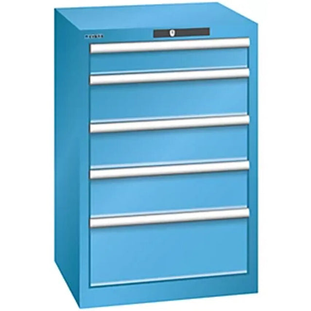 Drawer cupboard, 5 drawers, WxDxH 564 x 572 x 850 mm, light blue. Supplied = assembled. Height = 850 mm. Width = 564 mm. Depth = 572 mm. Max. drawer load = 75 kg. Number of drawers = 5 pcs. Drawer height = 1x100, 3x150, 1x200 mm. Drawer extension = 100%. Body colour = light blue RAL 5012. Front colour = light blue RAL 5012. Fittings = individual pull-out stop. Material = welded sheet steel. Drawer guide = differential guide rails without cross beams. Lock type = KEY lock (individual keys) with central locking and replaceable cylinder, incl. 2 keys with key number. Internal drawer dimensions = 459x459 mm. Feature = can be labelled. Overall max. load = 4000 kg. Drawer cupboard paintwork: Impact resistant and hardwearing surface due to environmentally friendly powder coating. Paintwork inside drawers: Full surface corrosion protection due to electro-deposition immersion painting, dove grey, NCS S 4502-B. Material: Very hardwearing due to precise and sturdy construction using high quality, welded sheet steel, max. load up to 4 tonnes. Tight closing drawer construction provides protection from dust and liquids. Individual drawer lock with lift-out protection, perfect usability due to 100% utilisation of space and free choice of partition material. Clearance height: 750 mm. Drawer WxD 459 x 459 mm, arrangement of front heights/effective heights: 100/82.5, 150/132.5, 150/132.5, 150/132.5, 200/182.5 mm.
