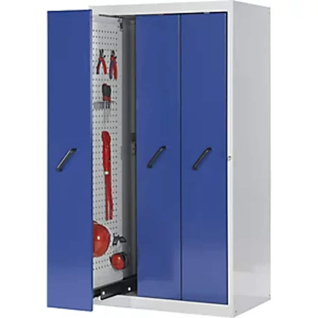 Vertical pull-out cupboard with front cover panels, with perforated panels, 3 drawers, grey/blue. Supplied = assembled. Height = 1950 mm. Depth = 695 mm. Width = 1000 mm. Max. cupboard load = 1000 kg. Material = steel, powder coated. Design = welded. Body colour = light grey RAL 7035. Door colour = gentian blue RAL 5010. Number of vertical drawers = 3 pcs. Max. load per drawer = 200 kg. Weight = 122 kg. Product type = vertical pull-out cabinets. With front cover panels. Applications: workshop, warehouse, production etc. Vertical drawers with pull-out stops as standard. Max. load 200 kg per drawer. Robust, powder coated steel construction. With perforated panels (can be used on both sides) Perforated panel HxD 1700 x 612 mm. Your advantage A high quality storage solution from Lista.