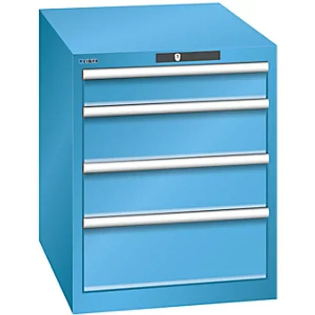 Drawer cupboard, 4 drawers, WxDxH 564 x 724 x 700 mm, light blue. Supplied = assembled. Height = 700 mm. Width = 564 mm. Depth = 724 mm. Max. drawer load = 75 kg. Number of drawers = 4 pcs. Drawer height = 1x100, 2x150, 1x200 mm. Drawer extension = 100%. Body colour = light blue RAL 5012. Front colour = light blue RAL 5012. Fittings = individual pull-out stop. Material = welded sheet steel. Drawer guide = differential guide rails without cross beams. Lock type = KEY lock (individual keys) with central locking and replaceable cylinder, incl. 2 keys with key number. Internal drawer dimensions = 459x612 mm. Feature = can be labelled. Overall max. load = 4000 kg. Drawer cupboard paintwork: Impact resistant and hardwearing surface due to environmentally friendly powder coating. Paintwork inside drawers: Full surface corrosion protection due to electro-deposition immersion painting, dove grey, NCS S 4502-B. Material: Very hardwearing due to precise and sturdy construction using high quality, welded sheet steel with max. load up to 4 tonnes. Tight closing drawer construction provides protection from dust and liquids. Individual drawer lock with lift-out protection, perfect usability due to 100% utilisation of space and free choice of partition material. Clearance height: 600 mm. Drawer WxD 459 x 612 mm, arrangement of front heights/effective heights: 100/82.5, 150/132.5, 150/132.5, 200/182.5 mm.