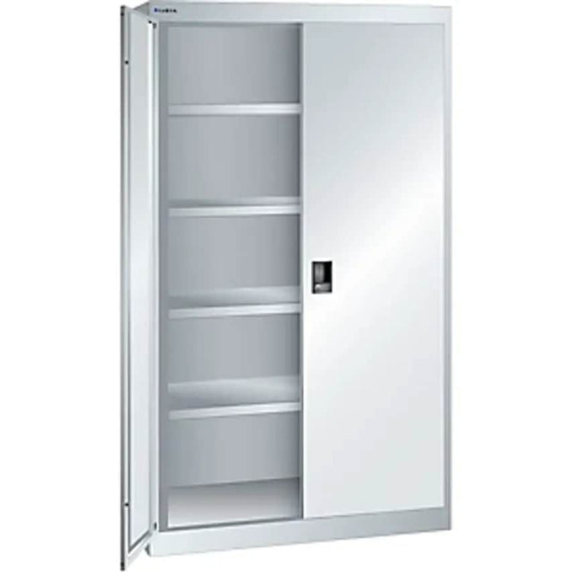 Heavy duty cupboard, 4 shelves, light grey. Supplied = assembled. Height = 1950 mm. Width = 1100 mm. Depth = 641 mm. Design = welded. Internal fittings = 4 shelves. Max. cupboard load = 1500 kg. Housing material = sheet steel. Door material = full sheet panelling. Shelf material = zinc plated. Body colour = light grey RAL 7035. Door colour = light grey RAL 7035. Max. shelf load = 160 kg. Shelf colour = light grey RAL 7035. Number of shelves = 4 pcs. Shelf width = 964 mm. Shelf depth = 549 mm. Door type = hinged door. Solid panel doors, fitted, bevelled from one piece. Optional: flush doors with hinge bracket, swivel range 90 degrees. Heavy duty cupboard with solid sheet metal hinged doors, cupboard housing with pivot pin bearings, 1 Key Lock flap lock with individual keys. 4 smooth adjustable shelves, WxD 964 x 549 mm, max. load 160 kg each, zinc plated.