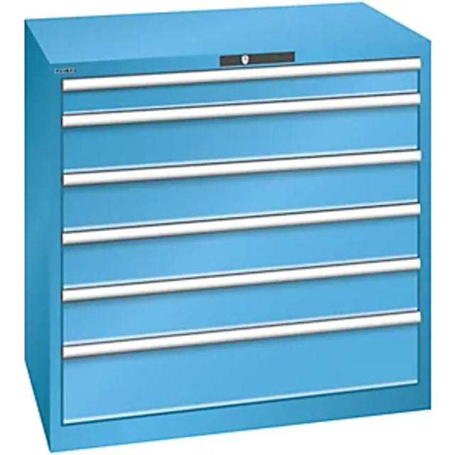 Drawer cupboard, sheet steel, HxW 1000 x 1023 mm, 6 drawers, max. load 200 kg, light blue. Supplied = assembled. Height = 1000 mm. Width = 1023 mm. Depth = 725 mm. Max. drawer load = 200 kg. Number of drawers = 6 pcs. Drawer height = 1x100, 4x150, 1x200 mm. Drawer extension = 100%. Body colour = light blue RAL 5012. Front colour = light blue RAL 5012. Fittings = individual pull-out stop. Material = sheet steel, powder coated. Drawer guide = differential guide rails without cross beams. Lock type = central locking with replaceable core cylinder lock. Feature = can be labelled. WxD 1023 x 725 mm (54 x 36 E) Smooth running drawers with differential guide rails without cross beams (100% extension) for medium to heavy duty requirements. Individual pull-out stops to protect against tipping. Huge amount of storage space. Robust, powder coated sheet steel construction. Smooth running drawers with differential guide rails without cross beams (100% extension) Central locking via cylinder lock. Also available with battery powered combination lock on request. Your advantage Top quality brand with 10 year guarantee.