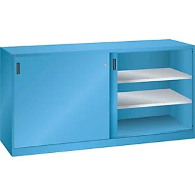 Sliding door cupboard with solid panel doors, 4 shelves, light blue. Supplied = assembled. Height = 1000 mm. Width = 2000 mm. Depth = 580 mm. Design = welded. Internal fittings = 4 adjustable shelves. Max. cupboard load = 950 kg. Housing material = welded sheet steel. Shelf material = zinc plated. Body colour = light blue RAL 5012. Door colour = light blue RAL 5012. Max. shelf load = 60 kg. Number of shelves = 4 pcs. Shelf width = 1000 mm. Shelf depth = 580 mm. Door type = sliding door. Solid panel doors, double bevelled and reinforced. Material: high quality welded sheet steel construction with max. housing loads of up to 950 kg. Paintwork: environmentally friendly powder coating for impact resistant and hardwearing housing surface. Solid panel sliding door cupboard with partition, WxH 2000 x 1000 mm. 4 slotted adjustable shelves, WxD 1000 x 580 mm, max. load 60 kg each, zinc plated. 1 DOM pin cylinder.