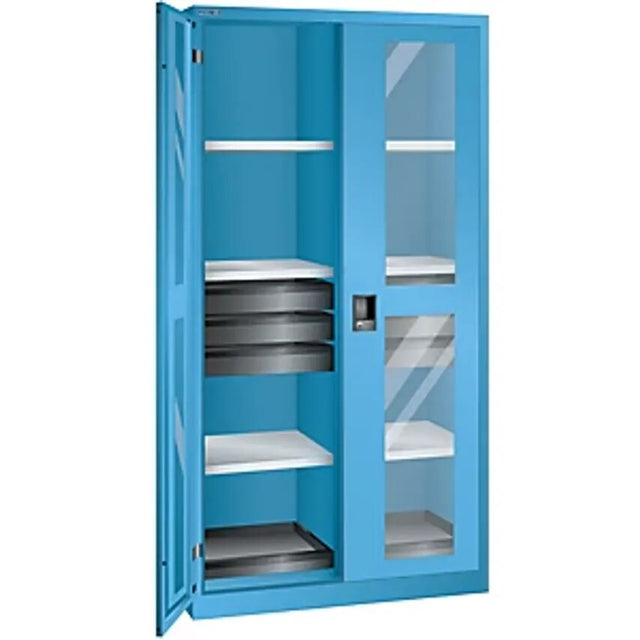 Cupboard with 2 viewing window doors, HxWxD 1950 x 1000 x 580 mm, with 8 shelves, 6 drawers, light blue. Supplied = assembled. Height = 1950 mm. Width = 1000 mm. Depth = 580 mm. Design = welded. Internal fittings = centre partition, 6 shelves, 2 pull-out shelves, 6 drawers. Max. cupboard load = 500 kg. Housing material = welded sheet steel. Finish = zinc plated. Shelf material = sheet steel, galvanised. Body colour = light blue RAL 5012. Door colour = light blue RAL 5012. Max. shelf load = 60 kg. Shelf colour = zinc plated. Number of shelves = 6 pcs. Shelf width = 480 mm. Shelf depth = 506 mm. Shelf height adjustment increments = 25 mm. Opening angle of doors = 115 . Modular furnishings for creating individual combinations. One system - many possibilities. Uniform system dimensions - everything is designed to fit together. Forklift accessible plinth as an accessory for quick and easy positioning. Door design: vision panel doors, flush, bevelled from one piece. Door bearings: hinge bearings for installation of adjustable shelves, drawers and pull-out shelves. Material: high quality welded sheet steel construction with max. housing loads of up to 500 kg. Paintwork: environmentally friendly powder coating for impact resistant and hardwearing housing surface. Interior fittings height adjustable in increments of 25 mm. Drawers WxD 357 x 459 mm, max. load 50 kg, mounted on ball bearings, full extension, arrangement on left: 95/72, 95/72, 95/72 mm, arrangement on right: 95/72, 95/72, 95/72 mm. Paintwork: full surface corrosion protection due to hardwearing powder coating. Pull-out shelves WxD 357 x 459 mm, front height/effective height: 53/43 mm, max. load per pull-out shelf 50 kg. Colour charcoal RAL 7016. Paintwork: full surface corrosion protection due to hardwearing powder coating. Material: high quality sheet steel. Adjustable shelves WxD 480 x 506 mm, thickness 30 mm, long sides 4x bevelled by 90. Can be fitted with adjustable shelves, drawers and pull-out shelves at a later stage.