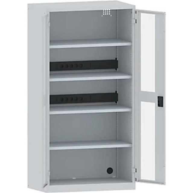 Battery charging cabinet, 4 shelves, vision panel doors, 2 power strips at rear, grey. Supplied = assembled. Door type = vision panel doors. Height = 1950 mm. Width = 1000 mm. Depth = 580 mm. Body colour = light grey RAL 7035. Front colour = light grey RAL 7035. Material = sheet steel. Number of shelves = 4 pcs. Lock type = cylinder lock with replaceable cylinder. Power supply = 2x5-fold (230 V) , rear. Max. shelf load = 60 kg. Shelf material = sheet steel, galvanised. Shelf height adjustment increments = 25 mm. Product type = battery charging cabinets with hinged doors. Flexible charging options for battery-operated electronic devices, BDE devices, notebooks, tablets and smartphones. Protected and organised cable guide. Devices are always locked away and are secure against unauthorized access. Sturdy, powder coated steel construction in light grey RAL 7035 or light grey/gentian blue RAL 5010. 18 other colours/colour combination, available at no extra cost. Cabinet housing including rubber spouts for protected cable guide and fan cover in the back wall. Cylinder lock with replaceable cylinder including two keys. Also available with battery powered combination lock on request. Zinc plated shelves, max. load 60 kg with evenly distributed load. Drawers (optional) with ball bearing mounted telescopic rails. Max. load 50 kg, drawer height 95 mm. Drawers and shelves height adjustable in 25 mm increments. Vision panelled hinged doors with hinge bearings. Opening angle approx. 115. Power strip with on/off switch and a 3 m cable. Sockets 230 V. Height x width x depth 1950 x 1000 x 580 mm. Information for deliveries to Switzerland: the trailing socket in this case features 4 sockets in accordance with legal regulations.