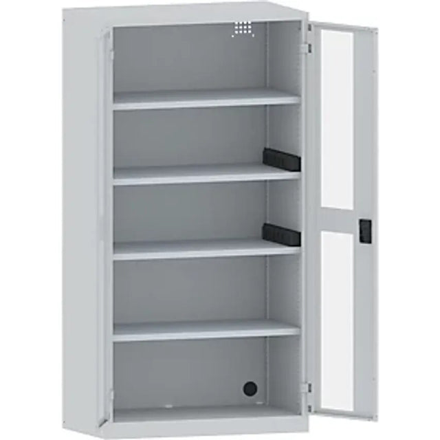 Battery charging cabinet, 4 shelves, vision panel doors, 2 power strips at side, grey. Supplied = assembled. Door type = vision panel doors. Height = 1950 mm. Width = 1000 mm. Depth = 580 mm. Body colour = light grey RAL 7035. Front colour = light grey RAL 7035. Material = sheet steel. Number of shelves = 4 pcs. Lock type = cylinder lock with replaceable cylinder. Power supply = 2x5-fold (230 V) , side. Max. shelf load = 60 kg. Shelf material = sheet steel, galvanised. Shelf height adjustment increments = 25 mm. Product type = battery charging cabinets with hinged doors. Flexible charging options for battery-operated electronic devices, BDE devices, notebooks, tablets and smartphones. Protected and organised cable guide. Devices are always locked away and are secure against unauthorized access. Sturdy, powder coated steel construction in light grey RAL 7035 or light grey/gentian blue RAL 5010. 18 other colours/colour combination, available at no extra cost. Cabinet housing including rubber spouts for protected cable guide and fan cover in the back wall. Cylinder lock with replaceable cylinder including two keys. Also available with battery powered combination lock on request. Zinc plated shelves, max. load 60 kg with evenly distributed load. Drawers (optional) with ball bearing mounted telescopic rails. Max. load 50 kg, drawer height 95 mm. Drawers and shelves height adjustable in 25 mm increments. Vision panelled hinged doors with hinge bearings. Opening angle approx. 115. Power strip with on/off switch and a 3 m cable. Sockets 230 V. Height x width x depth 1950 x 1000 x 580 mm. Information for deliveries to Switzerland: the trailing socket in this case features 4 sockets in accordance with legal regulations.