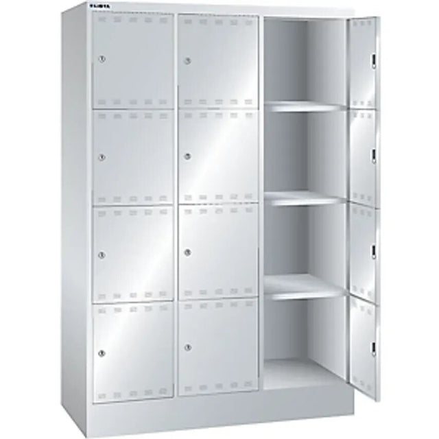 Battery charging cabinet with lockable compartments, with 3 x 4 compartments, 1 x 230 V, 2 x USB, grey. Supplied = assembled. Height = 1795 mm. Width = 1205 mm. Depth = 582 mm. Body colour = light grey RAL 7035. Front colour = light grey RAL 7035. Material = sheet steel. Number of compartments = 3x4 pcs. Lock type = cylinder lock with replaceable cylinder. Power supply = 1x230 V/2 x USB. Max. shelf load = 60 kg. Shelf material = sheet steel, galvanised. Shelf height adjustment increments = 25 mm. Product type = battery charging cabinets with lockable compartments. Flexible charging options for battery-operated electronic devices, BDE devices, notebooks, tablets and smartphones. Large range of different uses (socket, power USB, RJ46) Air circulation thanks to front and back ventilation slots. Versatile locking system possible (combination lock, coin lock, etc.) Ideal for personal storage of all types of battery-charged devices. Whether for industry, trade, offices, schools, universities or public buildings: Thanks to the built-in sockets, batteries can be charged during storage and are therefore ready for immediate use. A variety of applications with charging options for notebooks, tablets, BDE devices, smartphones and battery operated electronic devices. Well designed ventilation with optimal circulation of air due to ventilation holes located on the front and back. Very large range of sockets, network sockets RJ45 and USB interfaces. Locks securely - devices are under lock and key at all times and are protected from unauthorised access. Very stable due to the all-around rolled side doors with a concave surface, hinged at the right. Sturdy, powder coated steel construction in light grey RAL 7035 or light grey/gentian blue RAL 5010. Additional 18 colours/colour combinations can be supplied at no extra cost. Compartment clearance height x compartment width 400 x 400 mm. Well organised labelling due to embossed label holders. Protection from dirt below the cabinet by means of a base with plinth (height 150 mm) Upon request, 18 additional colours/colour combinations available at no extra cost.