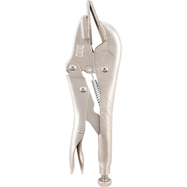 Model 8R Makes bending, forming, and crimping jobs easier. Turn screw to adjust pressure and fit work. Stays adjusted for repetitive use. Constructed of high-grade heat-treated alloy steel for maximum toughness and durability. Guarded release trigger quickly unlocks and protects from accidental release. Size: 8" (200mm). Jaw capacity: 1/2" (13mm). Throat depth: 1,3/4" (44mm). Jaw width: 3,1/8" (78mm).