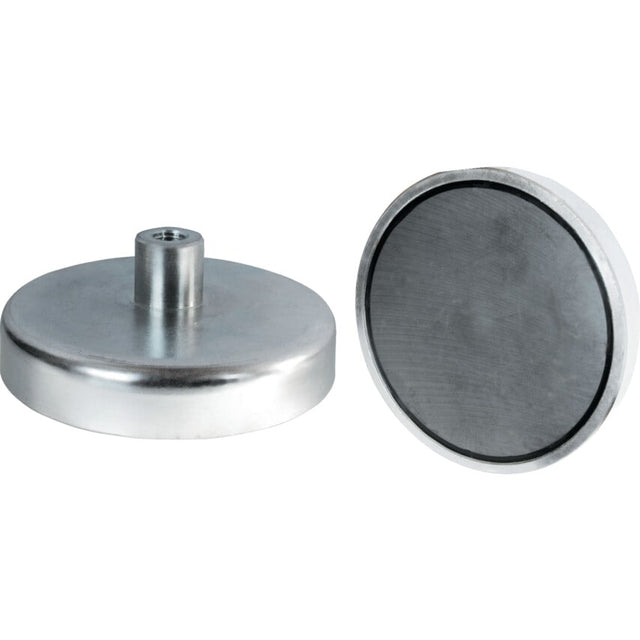 Neodymium magnet in a cylindrical brass pot. Assembled with steel pole pieces to give a multi-pole effect which offers superior grip at the contact face ideal for clamping or lifting application. Ideally work at temperatures up to 80C, but have a maximum working temperature of 100C