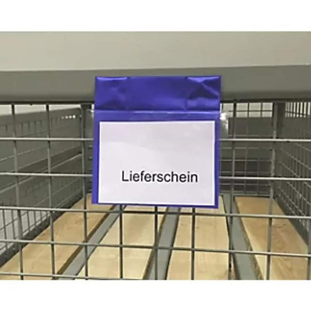 Neodymium magnetic pockets, landscape format, with rain protection flap, pack of 25, blue, A5, 1+ packs. Supplied = assembled. Colour = blue. Description of document pouch = with rain protection flap. Type of mounting = magnetic. Model = landscape. Product type = document pouches. With two extremely powerful magnets. For labelling metallic storage and transport containers.