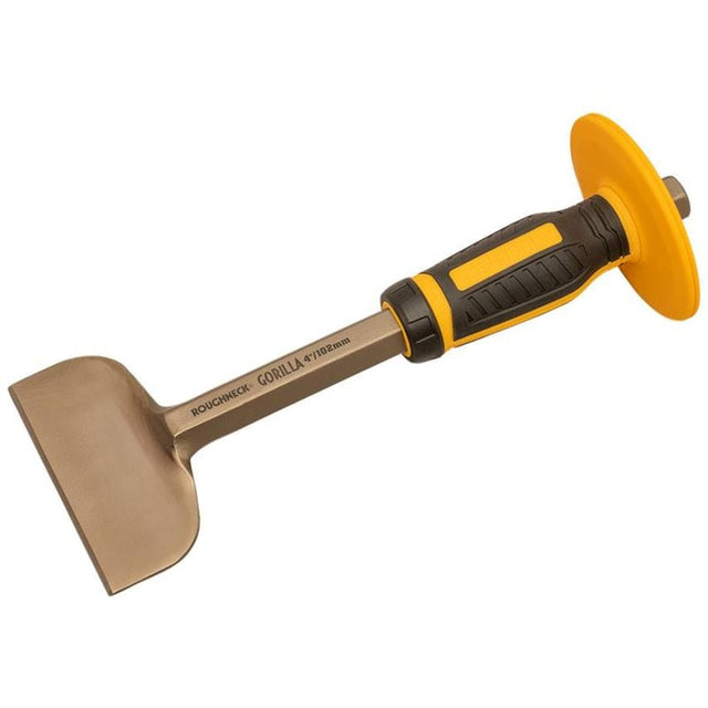The Roughneck Gorilla Brick Bolster is manufactured from drop-forged and heat-treated superior quality chrome vanadium steel to ensure outstanding toughness and long-life performance. The 45 single chamfer cutting edge offers the optimal balance between cutting performance and longevity. Equipped with a patented non-slip guard that securely locks onto the shaft. Eliminates the age-old problem of grips slipping up the shaft during impact. Additionally, the guard can be removed within seconds to improve access in tight areas or to aid flush cutting.