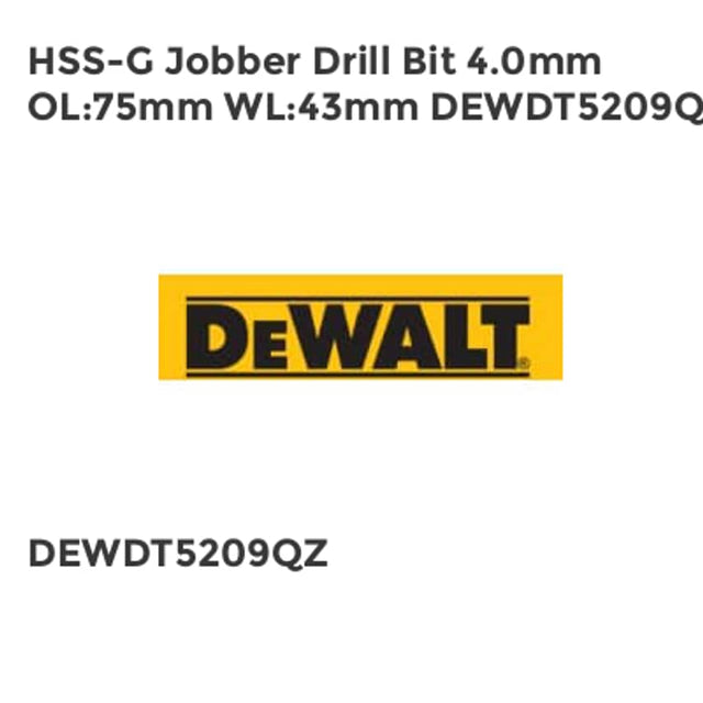 The DEWALT HSS G-Jobber Drill Bit is a precision ground twist drill bit for rapid drilling, long-life and excellent concentricity. It has been manufactured from High-Speed Steel that conforms to DIN 338. The drill bit is ground from solid stock and has a right-hand cutting, type N flute with a precision ground end at 118 point angle.