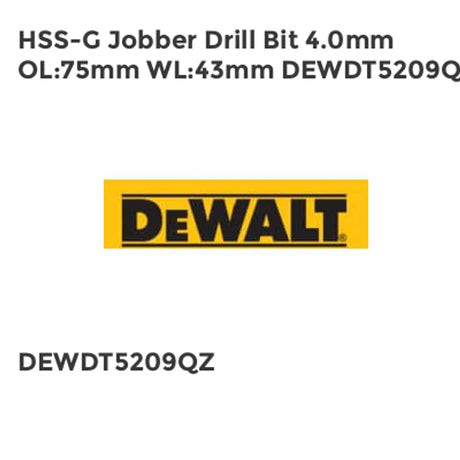 Low stock (10 units)£5.49Unit price /UnavailableHSS-G Jobber Drill Bit 4.0mm OL75mm WL43mm DEWDT5209QZ