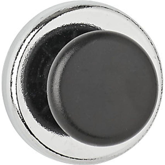 Power magnet with handle knob, pack of 10, 38 mm, holds 5 kg, light silver. Diameter = 38 mm. Colour = light silver, black. Adhesive force = 5 kg. Shape = round. Design of magnets = with handle knob. Material = ferrite, plastic, steel. Feature = magnetic. Height = 42 mm. Product type = round magnets, hook magnets. Large magnet with a large knob. High holding force. Ideal for securing workwear in metal lockers, for signs or bags. Robust housing made of steel, knob made of sturdy plastic. Bottom side of ferrite magnet covered with felt to protect the adhesive base. Easy to grip, interval between magnet and knob 16 mm.