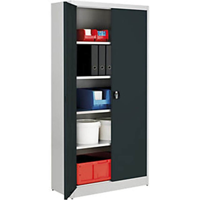 Heavy duty double door cupboard, HxW 1950 x 950 mm, depth 420 mm, light grey/charcoal. Supplied = assembled. Height = 1950 mm. Width = 950 mm. Depth = 420 mm. Design = welded. Max. cupboard load = 700 kg. Housing material = sheet steel. Door material = sheet steel. Finish = stove enamelled. Shelf material = sheet steel, galvanised. Body colour = light grey RAL 7035. Door colour = charcoal RAL 7016. Max. shelf load = 110 kg. Number of shelves = 4 pcs. Shelf height adjustment increments = 35 mm. Door type = hinged door. Opening angle of doors = 135 . Each shelf can be loaded with 110 kg. Ideal for medium weight goods for storage. Includes four zinc plated shelves. Robust, powder coated sheet steel construction. Body in light grey RAL 7035. Rotary cylinder lock with exchangeable cylinder which can be replaced without tools. Four zinc plated shelves, height adjustable in 35 mm increments. With height adjustment screws (15 mm) Your advantage High max. shelf/cupboard load - the economical solution if you also have to store heavier parts.