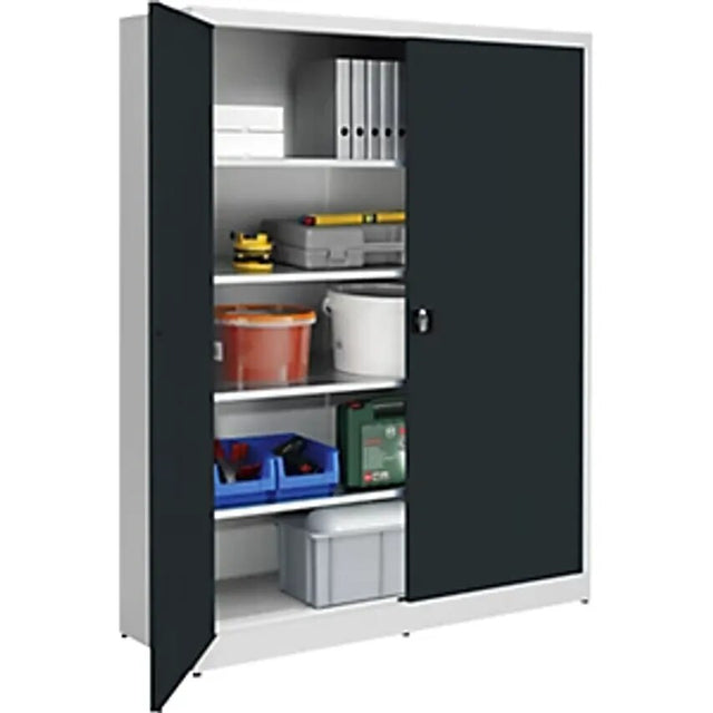 Jumbo double door cupboard, width 1500 mm, 4 shelves, depth 600 mm, doors charcoal. Supplied = assembled. Height = 1950 mm. Width = 1500 mm. Depth = 600 mm. Design = welded. Max. cupboard load = 500 kg. Housing material = sheet steel, stove enamelled. Body colour = light grey RAL 7035. Door colour = charcoal RAL 7016. Max. shelf load = 80 kg. Number of shelves = 4 pcs. Shelf height adjustment increments = 35 mm. Door type = hinged door. Opening angle of doors = 135 . 1500 mm wide - ideal for large and bulky parts. Sturdy, welded steel construction. High max. shelf load of 80 kg. Extremely robust and stable, stove enamelled steel construction. Body always in light grey RAL 7035. Four zinc plated shelves, height adjustable in 35 mm increments. Rotary handle with security cylinder lock. Applications: workshop, warehouse, production etc. Your advantage Storage space for particularly wide objects.