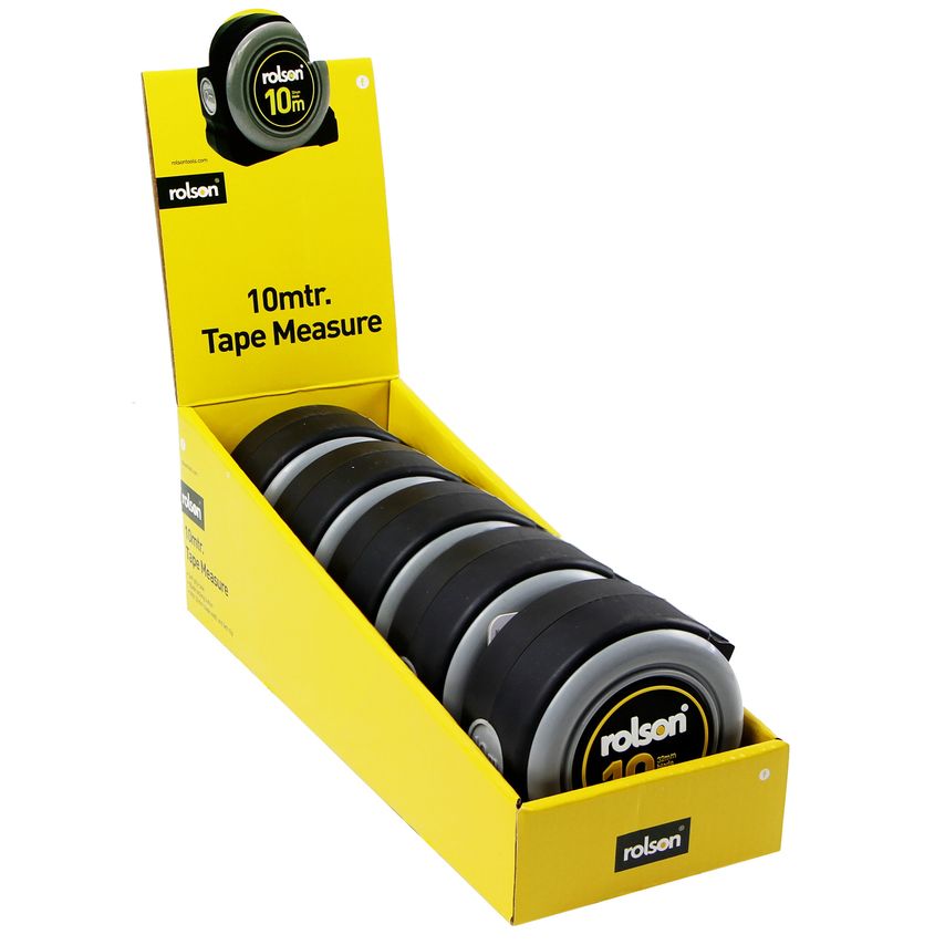 10m in length and 32mm width blade. Impact resistant plastic housing with rubber outer cover. Thumb operated lock with belt clip on reverse