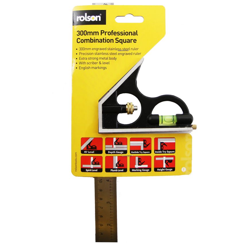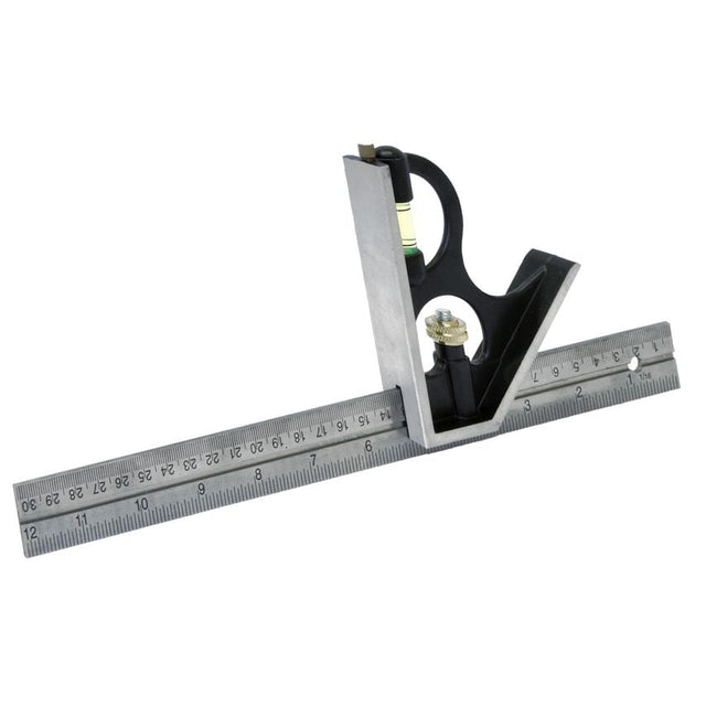 Heavy duty die cast metal body, with built in spirit level, brass nut and scriber fittings. Hardened steel 300mm rule and is etched with clear graduations