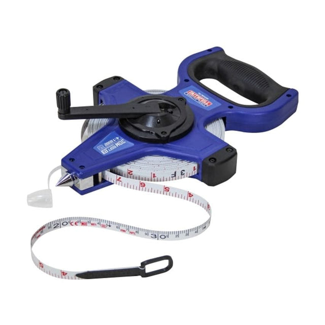 The Faithfull Fast Rewind Open Long Tape features a 13mm wide Class III blade that is clearly marked in both imperial and metric measurements. The fibreglass tape is resistant to stretching, scuffs, is impervious to moisture and has a metal end hook. Its large measurement increments are clear and easy to read in almost all weather conditions. The tape is easy to wipe clean after use. The tough ABS open frame case has a fold away rewind handle, a sturdy hand grip and an integral ground spike, making it ideal for single person use. Its superfast geared rewind system has a 4:1 ratio which allows the tape to be rewound back into the case at an extreme rate.