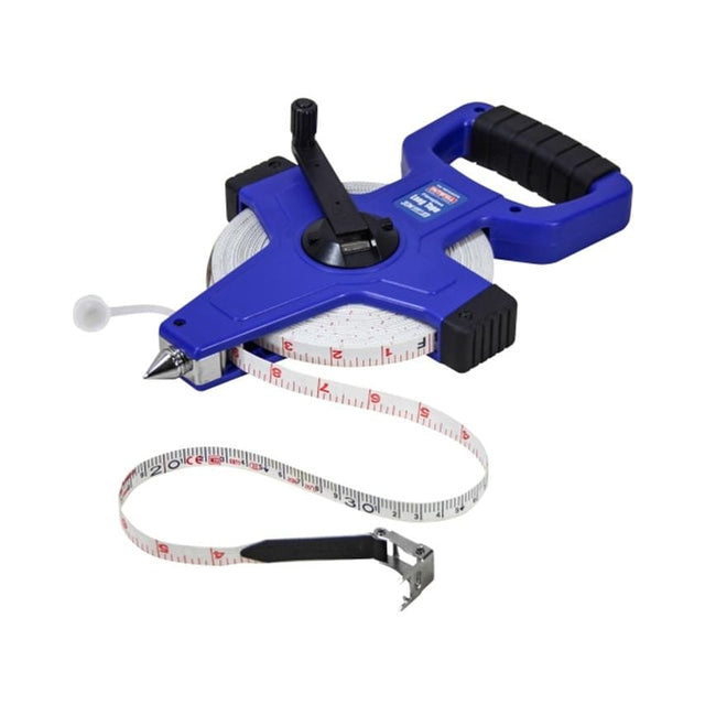 This Faithfull Fibreglass Open Long Tape comes with a 13mm wide class III blade which is marked in both imperial and metric measurements. The fibreglass tape is resistant to scuffs, stretching, is impervious to moisture and comes fitted with a folding metal end hook. Its large measurement increments are clear to read in almost all weather conditions, and the tape is also easy to clean. The tough ABS open frame case has a fold away rewind handle, a comfortable, sturdy hand grip and an integral metal ground spike making it ideal for single person use. A geared rewind system allows the tape to be rewound back into the case at a fast rate. Accuracy: EC Class III.