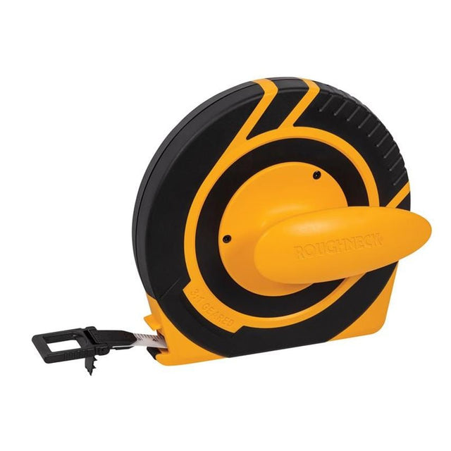 The Roughneck Closed Long Tape features double-injected ABS housing with tough TPR casing to provide outstanding protection and durability. Wide, easy to read, fibreglass blade with a blade guard coating for protection. Geared mechanism with 31 retrieve ratio for fast and smooth blade retraction. Turning up to 1.3m in just 1 rotation, reducing time and effort. Innovative handle drive release mechanism prevents handle rotation when drawing tape. Unique, ergonomic one-hand grip vastly improves handling and comfort. Accuracy EC Class II.