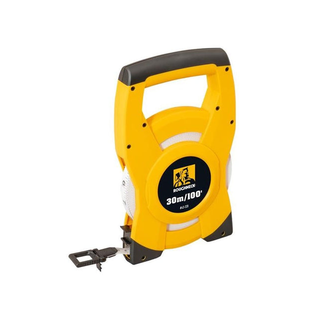 The Roughneck Open Long Tape features double-injected ABS housing with tough TPR casing to provide outstanding protection and durability. Wide, easy to read, fibreglass blade with a blade guard coating for protection. Geared mechanism with 3:1 retrieve ratio for fast and smooth blade retraction. Turning up to 1.3m in just 1 rotation, reducing time and effort. Innovative handle drive release mechanism prevents handle rotation when drawing tape. Unique, ergonomic one-hand grip vastly improves handling and comfort. Accuracy: EC Class II.