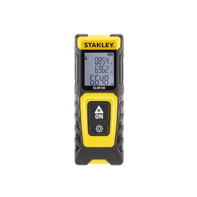 The STANLEY SLM100 Laser Distance Measure is suitable for a wide range of professional measuring applications. It is easy-to-use, thanks to its two-button operation one to activate the device and take measurements, and a cog button to select different functions. Equipped with a generously-sized screen that displays two rows of measurements. Black characters on a white background make it easy to read measurements, even in bright conditions. The two-point system facilitates measurements from either the top or base of the unit, providing accuracy and flexibility in a multitude of measuring scenarios. Robust, reliable and durable, it has been subjected to a 1M impact drop test to ensure it withstands knocks and bumps, so every professional feels confident using it around the work site. A power saving mode will protect battery life by automatically turning off the laser after 120 seconds and the screen after 180 seconds. Specification Functions distance, area, volume, and indirect height measurements via Pythagoras calculations Accuracy & plusmn 3mm Operating Range 30m Protection Rating IP40 Power 2 x AAA batteries (supplied)