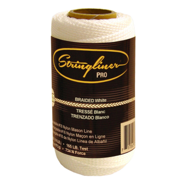 250 Foot White Braided String Line Core Only Strong and durable; the line has a tensile strength of 165 lbs. And braided property means it won't twist or tangle as easily; it is wound on a 1 inch diameter core and fits Stringliner Pro handles so you can easily switch out rolls of twine. Stringliner Masons Braided Line is durable and available in a wide range of bright, solid colours Quality #18 Nylon Line (tensile strength 165 lbs.)
