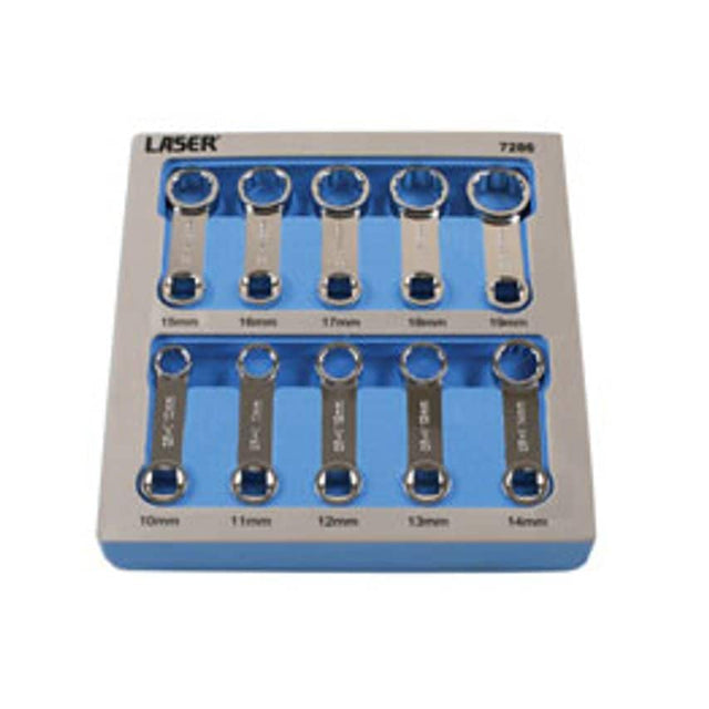 Set of torque extension adaptors (crow's foot ring spanners) for use in restricted access applications, extending the reach of the torque wrench by a defined length. 3/8"D x Bi-Hex (12pt) profile; length range: 65 - 70mm.Sizes: 10, 11, 12, 13, 14, 15, 16, 17, 18, 19mm. Torque setting must be adjusted to allow for the effective increase in leverage length. Manufactured from polished chrome vanadium.
