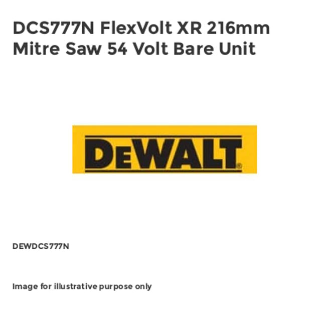 The DEWALT DCS777 FlexVolt XR Cordless Mitre Saw is fitted with an XPS shadow line cut indicator that provides fast, accurate alignment of the blade whilst illuminating the work piece for increased productivity, with no adjustment required. The base and fence has been machined to meet the accuracy requirements of the most demanding applications. With a head lock function that allows the head to be fixed, restricting the traverse function for trim applications and ease of transport. Intergrated positive mitre stops at 15, 22.5, 30 and 45 with a quick release mitre mechanism up to 50. Sliding left-hand fence with measuring scale for improved material support and a compact internal rail design for a large cutting capacity whilst remaining transportable. Specifications: No Load Speed: 6,300/min.Blade: 216 x 30mm Bore.Capacity (mm): 90/90: 270x62, 90/45: 270x48, 45/90: 190x62, 45/45: 190x48.Max. Depth of Cut: 80mm.Mitre Cut (Right/Left): 50/50.Bevel Capacity: 48.Weight: 14kg.