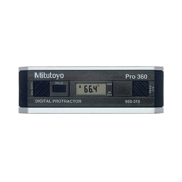 A high-resolution Mitutoyo digital protractor/level designed for making precise angle measurements in the vertical plane. The instrument can be zeroed at any angular position and directly indicates the angle between the stock and that position when in use to a resolution of 0.01 degree over a range of +/- 10 degrees (0.1 degree over the remainder of the range). When zeroed at the horizontal, readings are provided in the same manner as a spirit level, but with the advantage of a range extending all the way to the vertical.