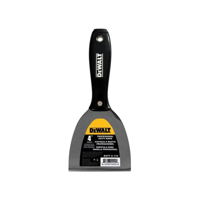 The DEWALT Jointing/Filling Knife has a premium stainless steel blade that has been hollow ground for precise flex. The knife feels nicely broken in on its very first use. Fitted with a lightweight, nylon handle that is impact/solvent resistant and ergonomically designed for all-day use with minimal fatigue. The handle has been riveted to the blade for additional strength. With an alloy metal hammer end for resetting drywall nails and added blade protection when dropped. It also features a hang hole for easy storage.