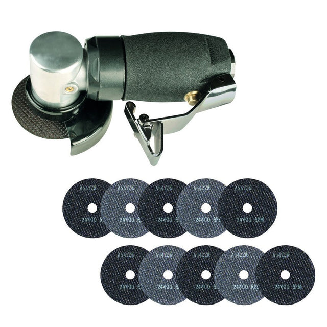 Includes mini angle disc cutter and discs (x10)Air tool for cutting and grindingDiameter: 50mm / Centre Bore: 10mmIdeal for use in hard to reach areasIncludes adjustable spark protectorReplacement discs available (10 Pack) - 90297500