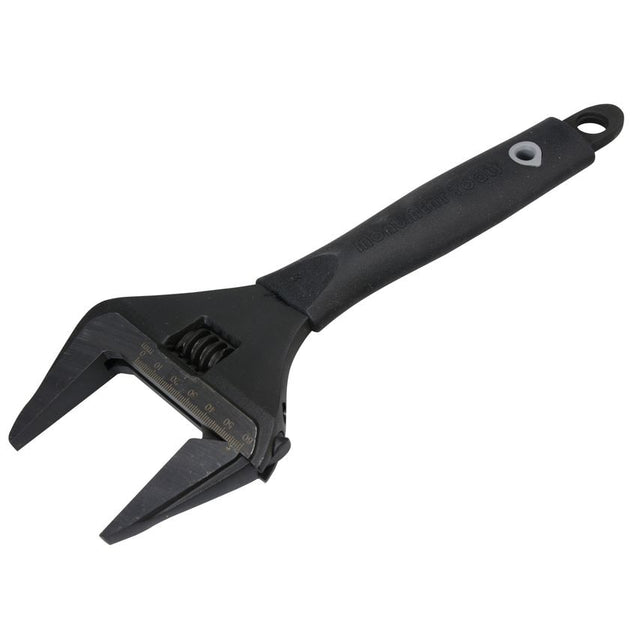 The Monument Wide Jaw Adjustable Wrench has a plastic rubber cushion handle, which is permanently adhered to the shank of the tool. Its soft, anti-slip material ensures a comfortable and strong grip. The jaw configuration of the wrench results in a stronger and better 'tool to fastener' contact point, providing a substantially durable tool. Made from Chrome Vanadium Steel with a Phosphate finish.