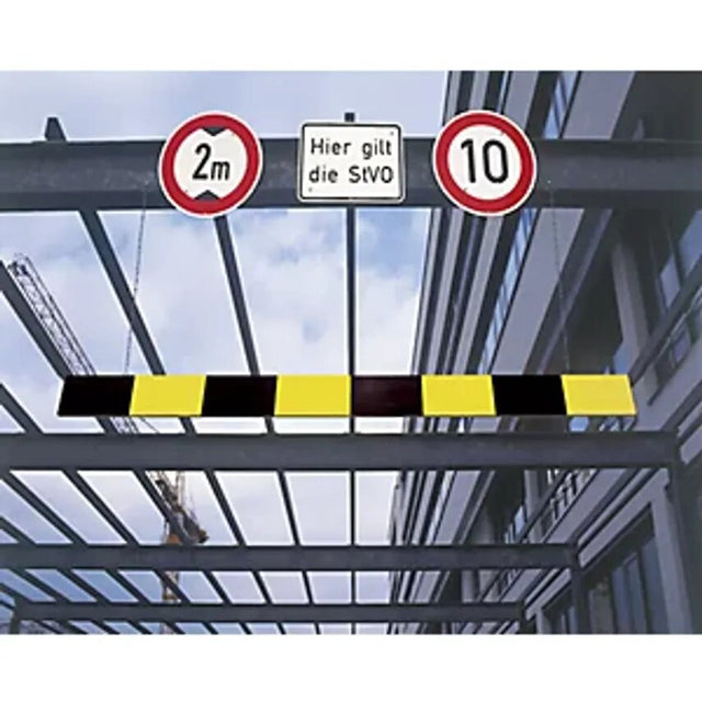 Aluminium height limiter, length 4000 mm, reflective black-yellow. Supplied = assembled. Barrier beam length = 4000 mm. Colour = black, yellow. Weight = 13 kg. Finish = adhesive film. Barrier boom profile = 150/20 mm. Barrier boom material = aluminium. Product type = height limiters. Secures entrances, underpasses and superstructures (passageways) For car parks, halls, buildings or facilities with height limits. Aluminium profile with protective caps at the side, 150/20 mm, covered with film on one side. Includes knotted chains, electrolytically zinc plated, 2 m long. Each with one end of the chain with a steel ring and bolt for screwing into the aluminium profile, the other end with a steel ring for suspension of the height limiter.