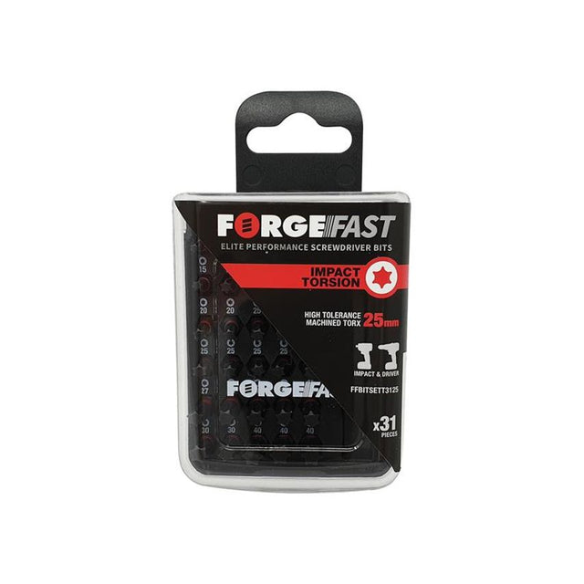 This ForgeFix 31 Piece ForgeFast Impact Bit Set contains a selection of ForgeFast TORX Compatible Impact Bits with a 1/4in hex shank. Made from specially engineered hardened steel to extend wear resistance and bit life. The optimal, shock absorbing torsion zone makes them ideal for high torque applications. The high tolerance machined tip reduces cam out and screw head damage. Supplied in a handy carry case with the following 30 x 25mm TORX Compatible Impact Bits TX10(x3), TX15(x3), TX20(x6), TX25(x7), T2X7(x2), TX30(x6) and TX40(x3). 1 x Bit Holder 60mm. Finish Black Phosphate